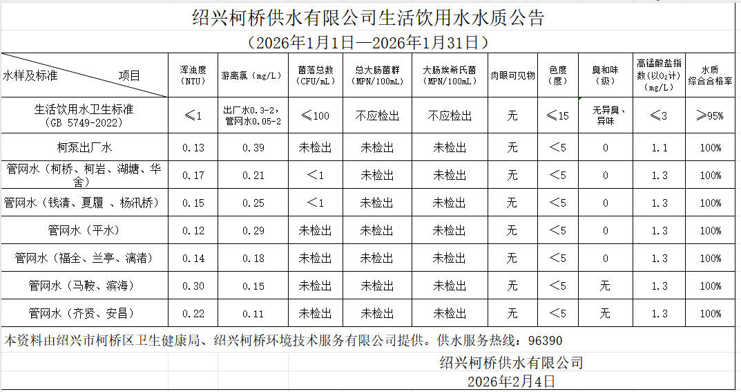 生活飲用水水質公告(2026年1月1日—2026年1月31日)