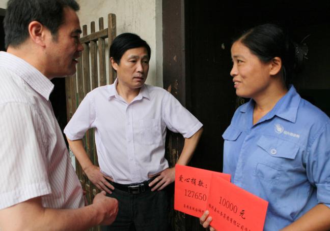8月1日上午,集團(tuán)倪阿泉、單寶子、高小林等領(lǐng)導(dǎo)在供水公司領(lǐng)導(dǎo)的陪同下專程前往錢清看望慰問了供水公司柯西分公司家庭受災(zāi)職工莫煜君,為她送去了集團(tuán)干部職工的愛心款127650元及集團(tuán)公司的資助款10000元,表達(dá)集團(tuán)及干部職工的關(guān)愛之情。莫煜君連聲道:“謝謝集團(tuán)公司,謝謝領(lǐng)導(dǎo)關(guān)心……”感激之情溢于言表。