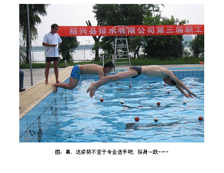 上午舉行第三屆職工游泳比賽,公司在柯橋南岸公園舉行第三屆職工游泳比賽。本次比賽項(xiàng)目分為男子個(gè)人50米、女子個(gè)人25米,此項(xiàng)水上運(yùn)動(dòng)公司已連續(xù)舉辦三年,深受職工歡迎,有近40名職工參加。比賽緊張有序,現(xiàn)場(chǎng)氣氛活躍,精彩場(chǎng)面不斷,加油聲不絕于耳。