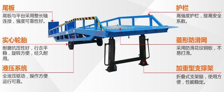 棗莊登車橋-集裝箱裝卸過橋-裝車斜坡登高裝貨叉車液壓登車橋-移動(dòng)式液壓登車橋應(yīng)用于無裝卸設(shè)備的貨臺(tái)及流動(dòng)裝卸場(chǎng)所,是與叉車配合使用的貨物裝卸輔助設(shè)備。借助該設(shè)備,叉車能直接駛?cè)肫囓噹麅?nèi)部進(jìn)行批量裝卸作業(yè)。只需單人操作,不需要?jiǎng)恿﹄娫矗纯蓪?shí)物的安全快速裝卸。即可使您減輕勞動(dòng)強(qiáng)度,又能成倍提高裝卸作業(yè)效率,加快物料流通速度,獲取更大經(jīng)濟(jì)效.臺(tái)面使用特制的菱形網(wǎng)絡(luò)板有可靠的強(qiáng)度,能保證長期使用而。它的菱形網(wǎng)狀結(jié)構(gòu),充分保證了防滑性能,使叉車有更好的爬坡性和可操作性。即使在雨、雪罐子。仍能保證正常使用。